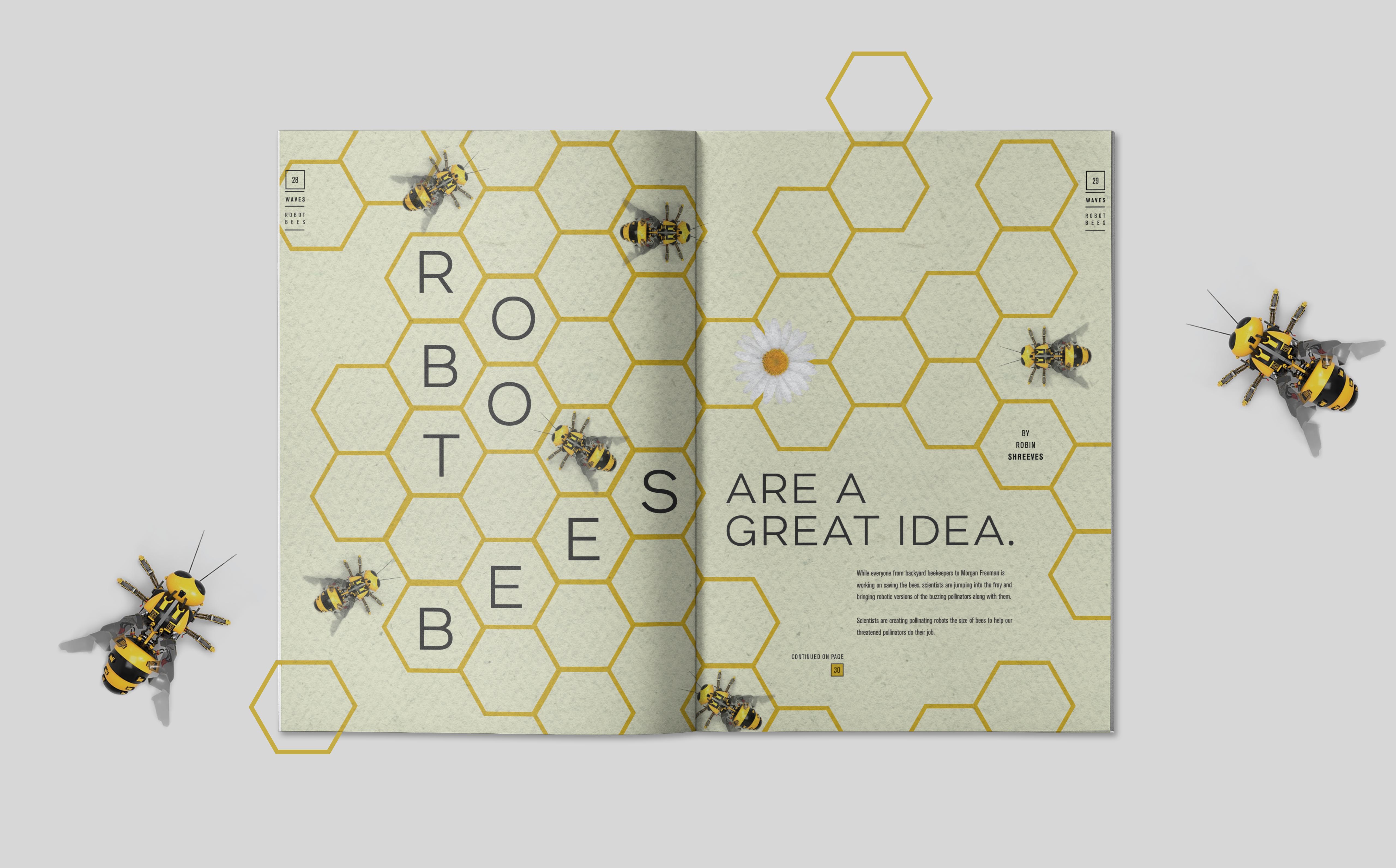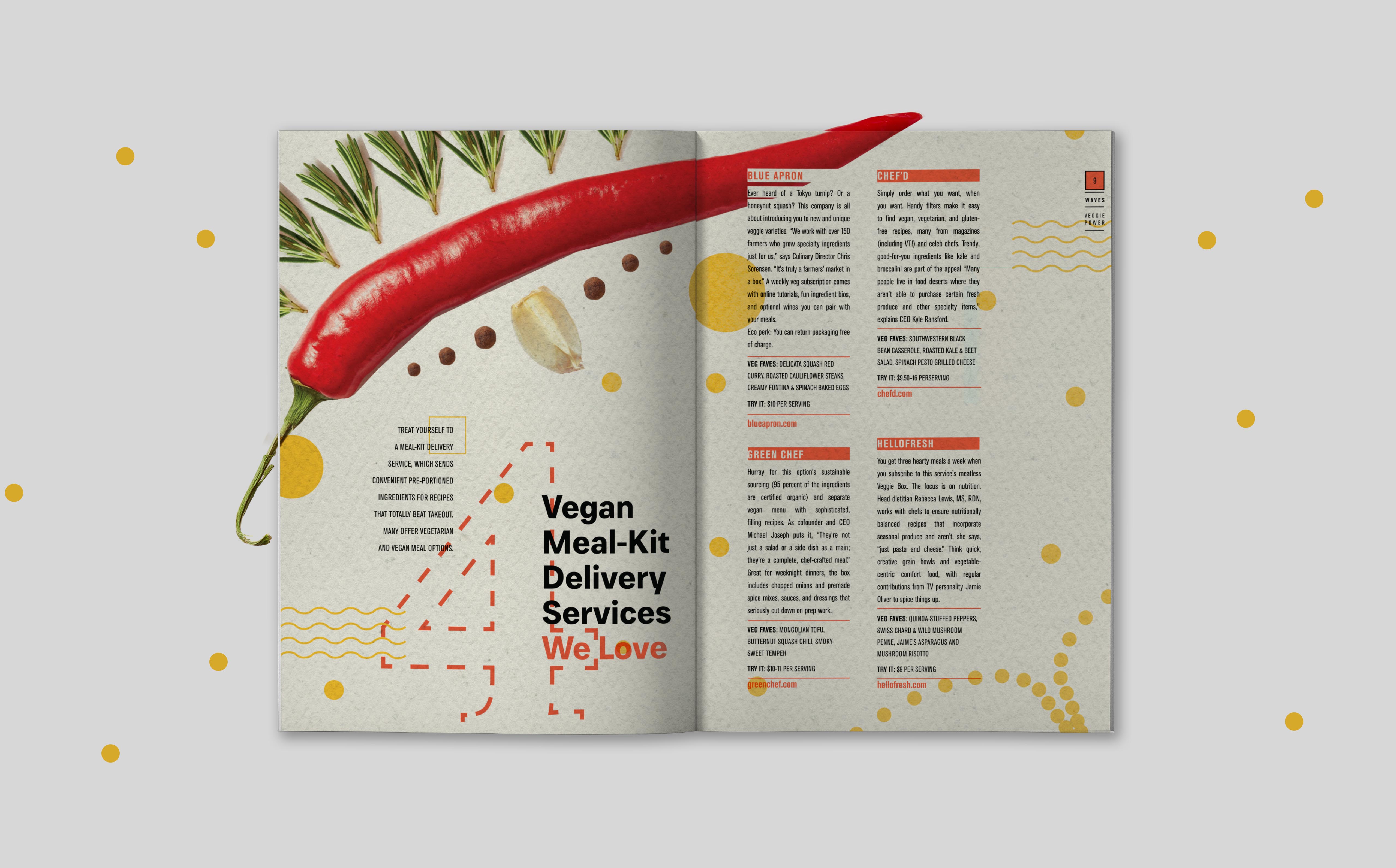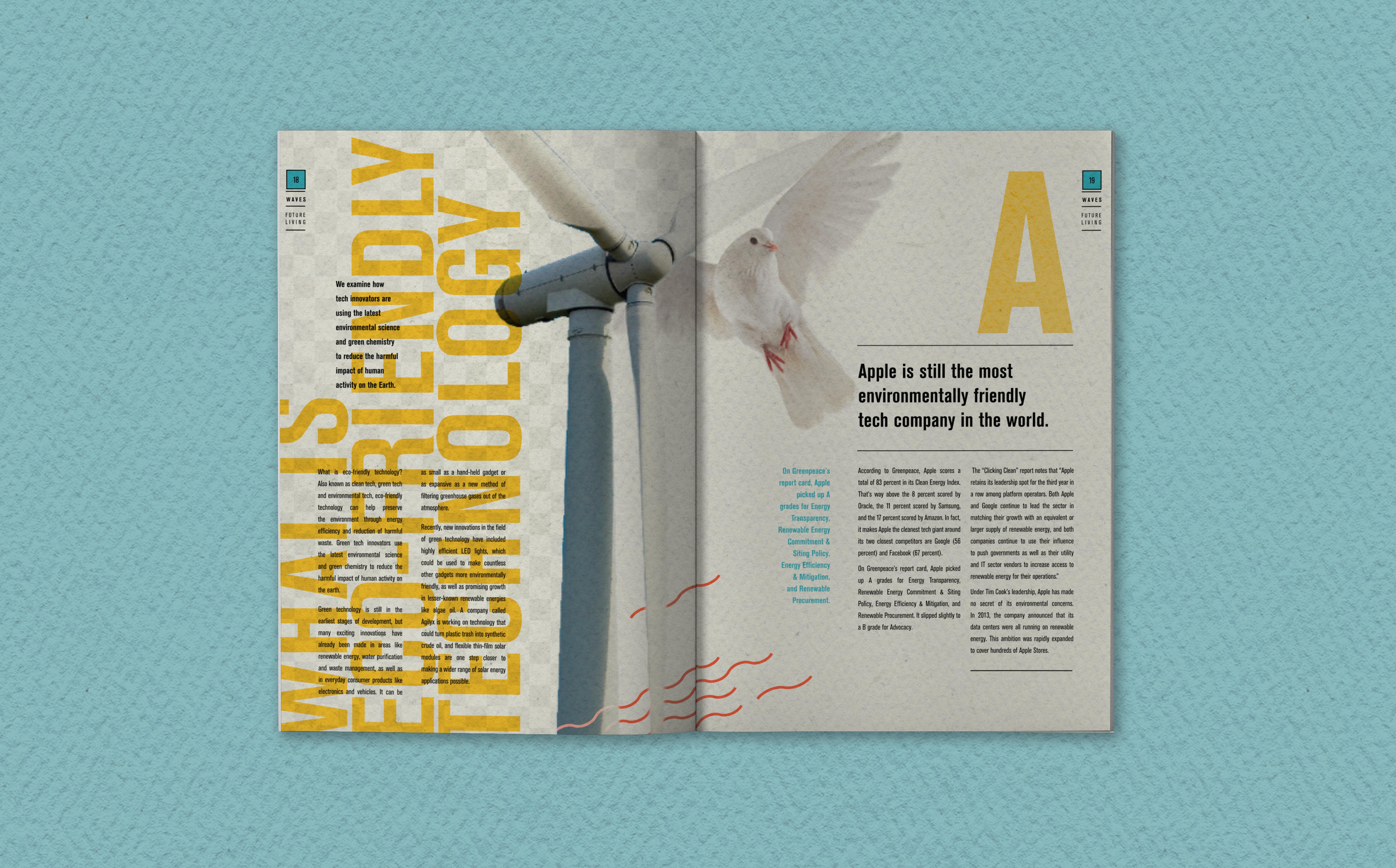 Waves is a self-initiated magazine concept exploring sustainable living through a contemporary visual and editorial lens. The design embraces a collage technique and a restrained ink footprint, paired with a bold six-color palette and recycled, highly textured paper to reinforce the magazine’s sustainable ethos.